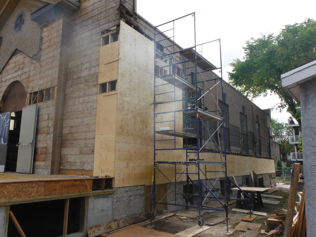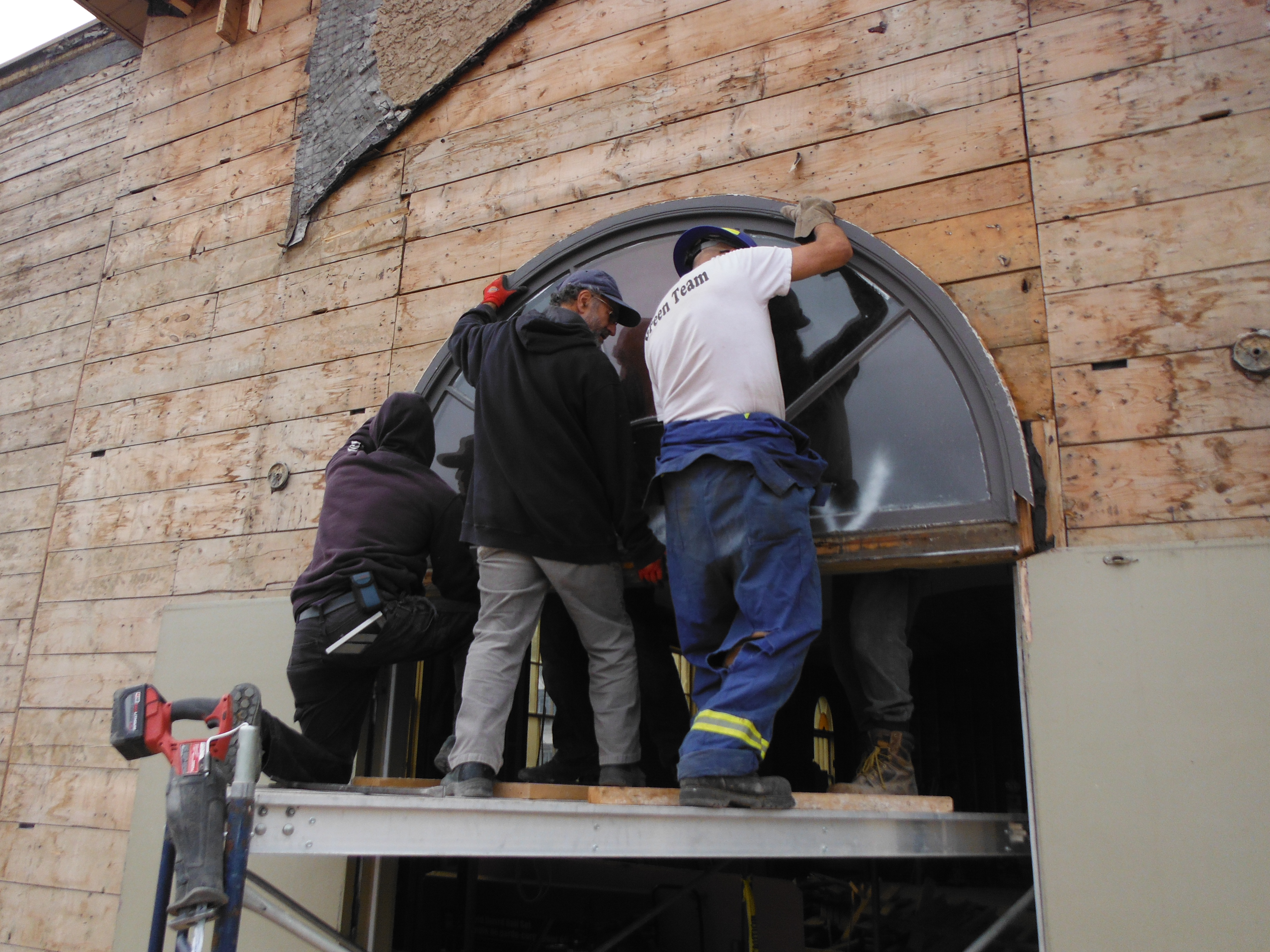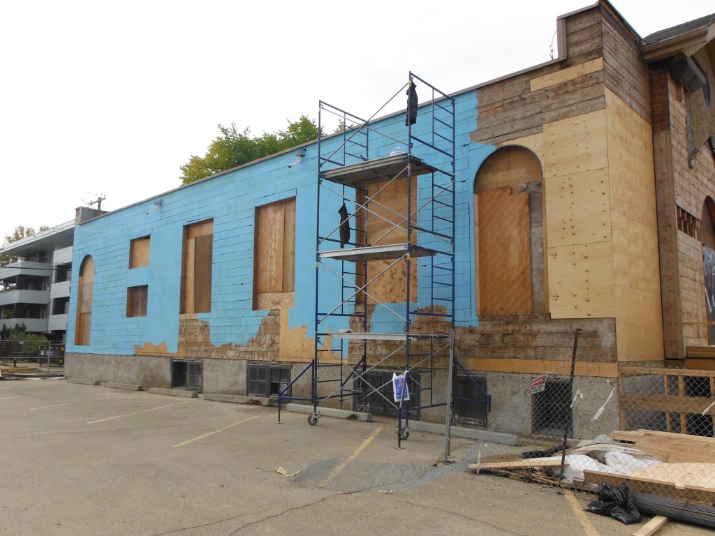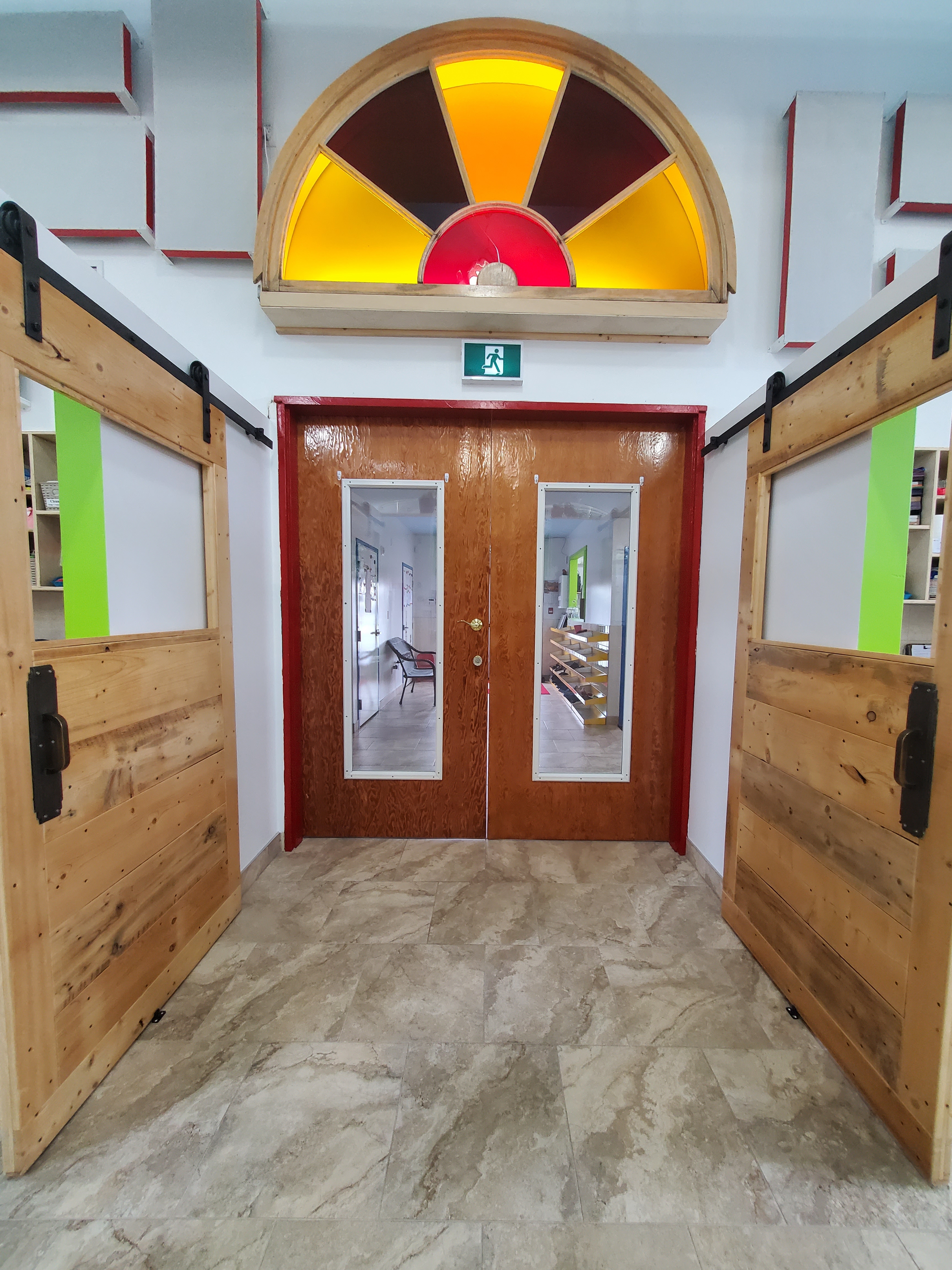The building itself was originally a church built in 1949. During the demolition and design phases, it was important for us to keep as much of the building’s history and character as possible. Throughout the centre bits and pieces of the original structure can be seen. Shiplap lumber that was used for forming and later the walls, have been turned in to sliding barn style doors for all the rooms. The original stained-glass window remains in its original place, but now lights up and overlooks the rooms on the main floor.